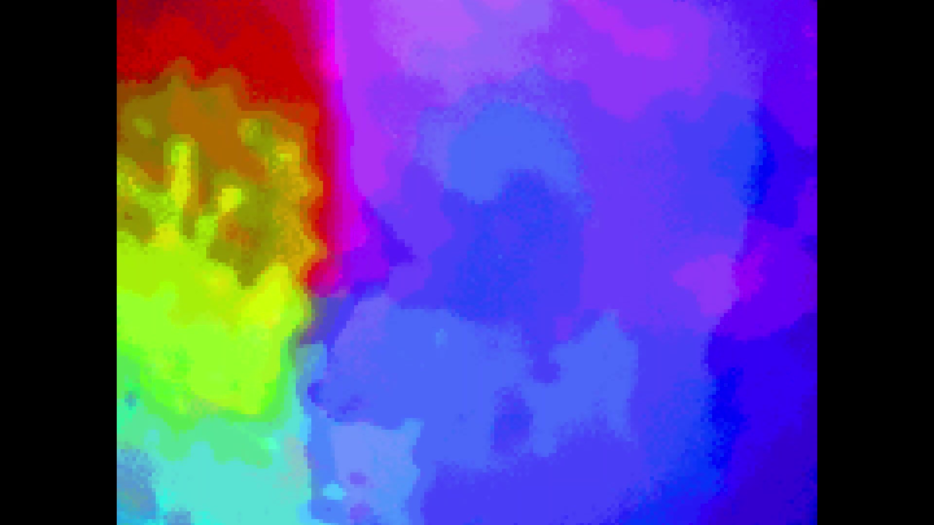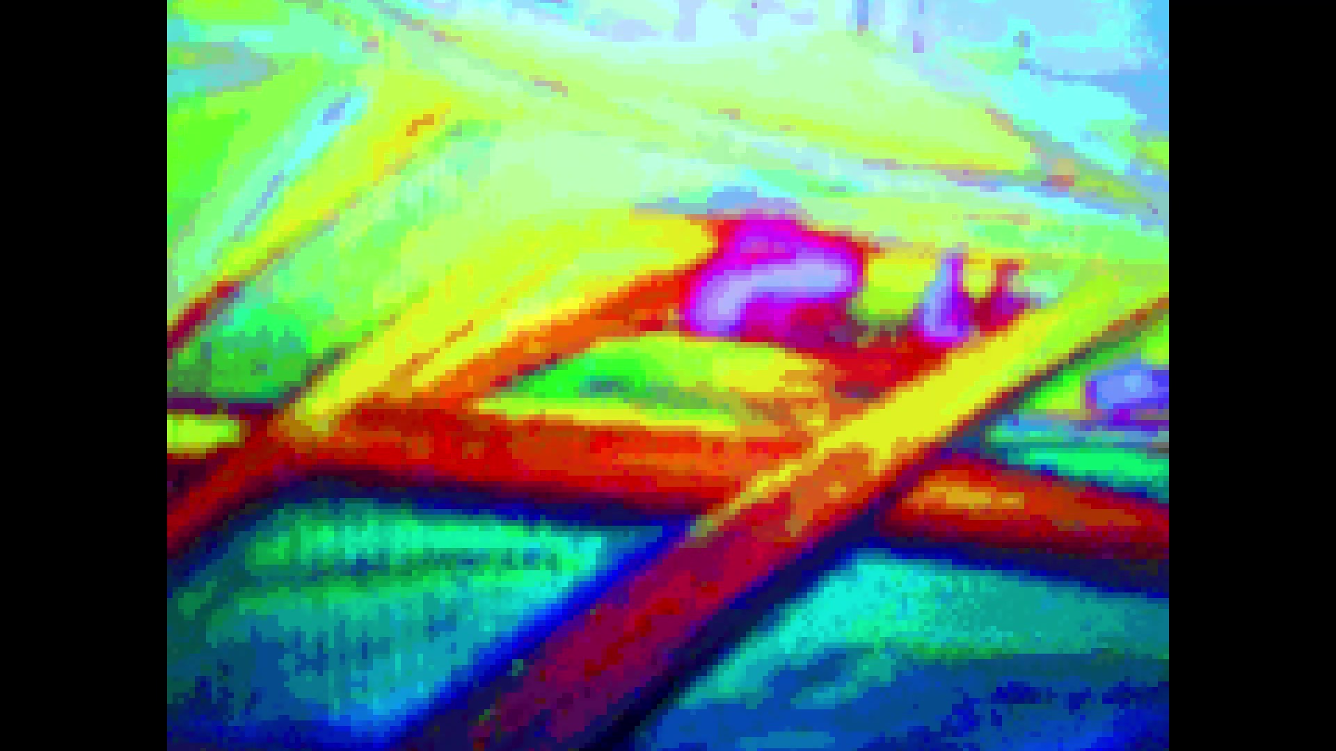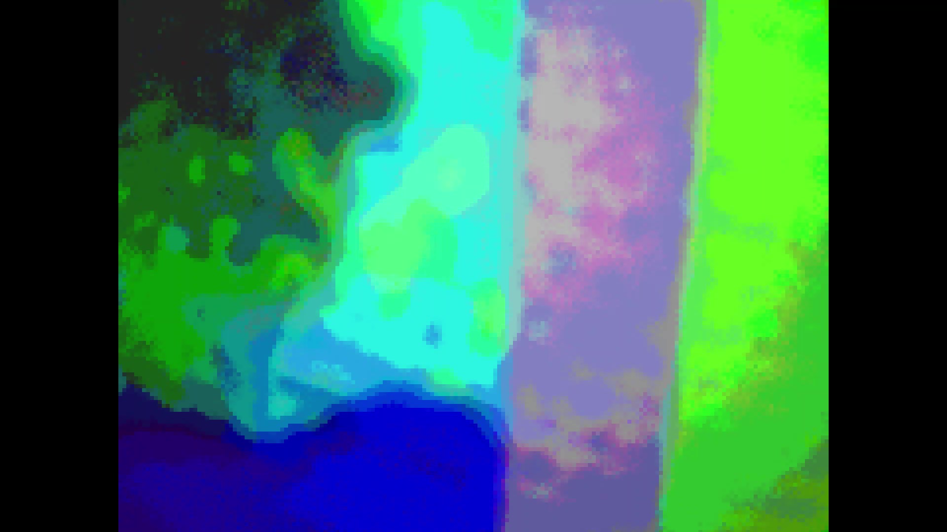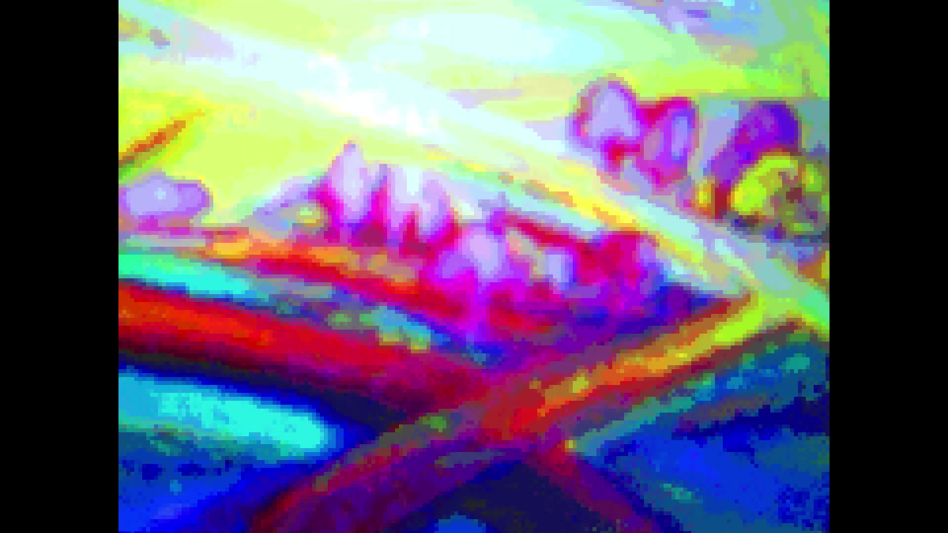 가상 세계의 색상은 구체적인 지형을 암시하지 않습니다. 그들은 인간과 자연 사이의 소외를 표시합니다. 영적 추구는 평화와 불확실성 사이에서 이루어집니다.